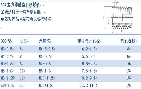 济宁自攻螺套外观上看主要有两种区分,一种是一端开槽型的,另一种是一端三圆孔型的,其中开圆孔型的又分为307型和308型两种,307型和308型外观主要区别就是同一直径下,长度和外径大小有所区分。以上各种型式螺套均具有自行攻牙功能。